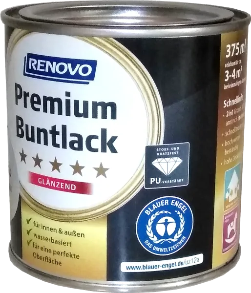 Renovo Premium Buntlack glänzend Zum Lackieren von Holz, Metallen u. v. m. Für den Außen- und Innenbereich geeignet Schnelltrocknend, kratzfest und wetterbeständig PU-verstärkt und wasserverdünnbar In unterschiedlichen Gebindegrößen erhältlich   Renovo präsentiert mit »Premium« einen Buntlack. Die vielseitig einsetzbare Farbe kann innen und außen verwendet werden und ist für Heizkörper, Fenster & Türen und Möbel geeignet. Die Farbe befindet sich in einer Dose. Der Glanzgrad in glänzend bewirkt Strahlkraft. Für ein unkompliziertes Auftragen eignen sich Holz, Eisen, Aluminium, Zink und Hart-PVC als Untergründe, die fest, sauber und trocken sind. Der wasserverdünnbare Buntlack ermöglicht ein leichtes Auftragen. Als Basis dient Wasser, was eine leichte Reinigung erzeugt….