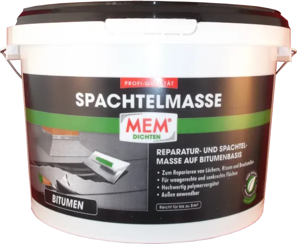 MEM PROFI SPACHTELMASSE lmf ist eine hochwertig polymervergütete Reparatur- und Spachtelmasse auf Bitumenbasis. MEM PROFI SPACHTELMASSE lmf eignet sich im Außenbereich zur Reparatur von Bitumendachbahnen, Blasen, Löchern, Rissen und Bruchstellen, zum Ausbessern von Dachkehlen, etc. Als Untergrund eignen sich Bitumen- Dachbahnen und Beschichtungen, Beton, Putz, Mauserwerk, Estrich, Metall, etc. Eigenschaften/Anwendung · MEM PROFI SPACHTELMASSE lmf ist eine hochwertig polymervergütete Reparatur- und Spachtelmasse auf Bitumenbasis. · MEM PROFI SPACHTELMASSE lmf eignet sich im Außenbereich zur Reparatur von Bitumendachbahnen, Blasen, Löchern, Rissen und Bruchstellen, zum Ausbessern von Dachkehlen, etc. · Als Untergrund eignen sich Bitumen- Dachbahnen und Beschichtungen, Beton, Putz, Mauerwerk, Estrich, Metall, etc. · MEM PROFI…