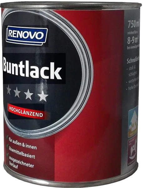 RENOVO Buntlack Lösemittelbasiert seidenmatt   Bei der Farbe handelt es sich um einen Buntlack von Renovo. Verwendung findet die vielseitig einsetzbare Farbe innen und außen und eignet sich für Türen, Zargen und Möbel. Mit anwendungsfreundlichen Eigenschaften überzeugt der Aromatenfreie Buntlack. Problemlos handhabbar ist die Farbe dank der praktischen Dose. Versehen mit einem Glanzgrad in hochglänzend oder seidenmatt ist der Buntlack pflegeleicht. Zur problemlosen Auftragung eignen sich Holz, Metall, Aluminium, Zink und Hart-PVC als Untergründe, die zudem fest, sauber und trocken sind. Lösemittel dient als verarbeitungsfreundliche Basis. Anwenderfreundlich ist der Anstrich, der deckend ist. Der Buntlack von Renovo begeistert durch beeindruckende Ergebnisse.   Eigenschaften ∙  Anwendungsbereich: Innen- und…