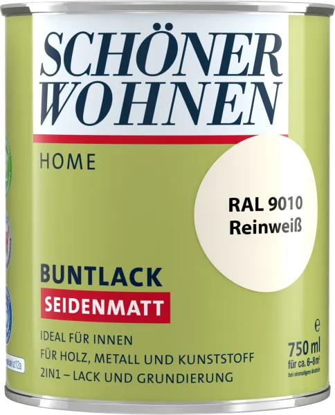 Schöner Wohnen Home Buntlack seidenmatt   Schnell trocknender Acryllack mit hoher Deckkraft und gutem Verlauf. Er ist ideal für innen . Auch außen anwendbar. Geeignete Untergründe sind Holz, Metall, Zink, Alu, Hart-PVC. Zum Beispiel für Türen, Fenster, Möbel, Kinderspielzeug, Holzverkleidungen, Heizkörper (bis +80 °C).     Verbrauch: ca. 100-120 ml/m² je Anstrich   Untergrund: Holz, maßhaltig Holz, nicht maßhaltig Kunststoff, Zink, Kupfer, Alu Eisen, Stahl   Verarbeitung: Rollen, Streichen Airless-Spritzen Kennzeichnung gemäß Verordnung (EG) Nr. 1272/2008 [CLP] Besondere Vorschriften für ergänzende Kennzeichnungselemente für bestimmte Gemische EUH208 Enthält 1,2-BENZISOTHIAZOL-3(2H)-ON. Kann allergische Reaktionen hervorrufen. EUH210 Sicherheitsdatenblatt auf Anfrage…