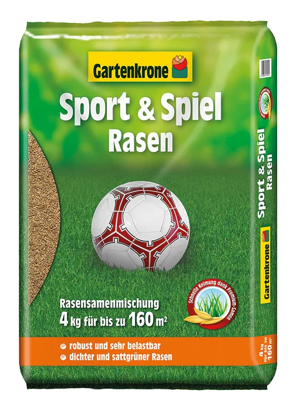 Gartenkrone Sport- und Spielrasen 4kg Mischung für strapazierfähige Rasenflächen Robust, belastbar und regenerationsfähig Dichter und sattgrüner Rasen Schnelle Keimung In verschiedenen Verpackungsgrößen   Eigenschaften Anwendungsbereich: Garten Einsatzbereich: außen Pflanzen-Art: Rasensamen pH-Wert: neutral (ph 6,5 – 7) Reichweite / Fläche: 160 m²   Technische Daten Blüte: Nein Deutsche Bezeichnung: Sport- und Spielrasen Düngung: nach Gebrauchsanleitung Lebenszyklus: mehrjährig Schnittgeeignet: Ja Standort: alle Standorte Winterhärte: Ja Wuchsform: aufrecht Geeigneter pH-Wert: neutral (ph 6,5 – 7)