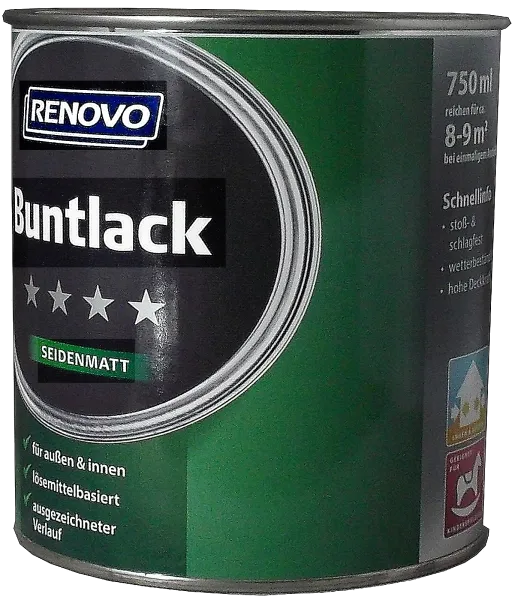 RENOVO Buntlack Lösemittelbasiert seidenmatt   Bei der Farbe handelt es sich um einen Buntlack von Renovo. Verwendung findet die vielseitig einsetzbare Farbe innen und außen und eignet sich für Türen, Zargen und Möbel. Mit anwendungsfreundlichen Eigenschaften überzeugt der Aromatenfreie Buntlack. Problemlos handhabbar ist die Farbe dank der praktischen Dose. Versehen mit einem Glanzgrad in hochglänzend oder seidenmatt ist der Buntlack pflegeleicht. Zur problemlosen Auftragung eignen sich Holz, Metall, Aluminium, Zink und Hart-PVC als Untergründe, die zudem fest, sauber und trocken sind. Lösemittel dient als verarbeitungsfreundliche Basis. Anwenderfreundlich ist der Anstrich, der deckend ist. Der Buntlack von Renovo begeistert durch beeindruckende Ergebnisse.   Eigenschaften Anwendungsbereich: Innen- und Außenbereich,…