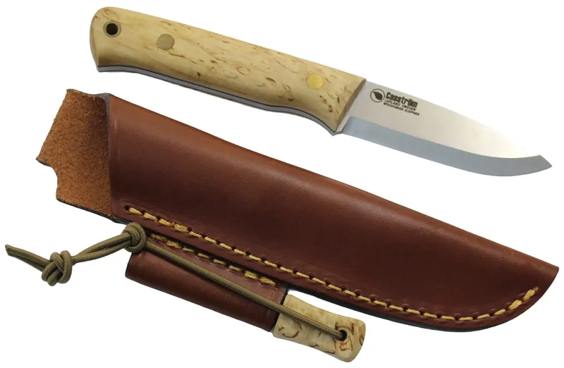 Casström Woodsman Messer Maserbirke mit Feuerstahl. Der rostträge Sleipner Stahl lässt sich relativ gut nachschärfen und ist dem D2 sehr ähnlich.