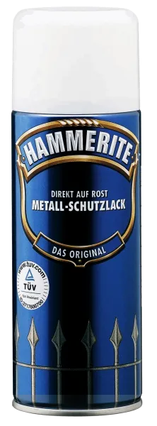 Anwendungsbereiche Rostschützende Lackierung für alle blanken, angerosteten oder mit Altanstrichen versehene Eisen-Metalle. Nichteisenmetalle wie z.B. Zink, Kupfer, Aluminium, Messing sowie feuerverzinkter Stahl müssen vor dem Auftrag mit Hammerite Metall-Schutzlack Matt (Aerosol) mit Hammerite Metall-Reiniger gereinigt und mit Hammerite Spezial- Haftgrund grundiert werden.   Eigenschaften Rostschutz und Lackierung in einem. Direkt auf Rost. Langzeit-Rostschutz. Gute Wetter-und UV-Beständigkeit. Gute Haftung.   Inhaltsstoffe Alkydharz, Lösemittel, Pigmente, Füllstoffe, Additive, Treibmittel.   Verbrauch 400ml sind ausreichend für ca. 0,5 m² bei 4-5 Sprühaufträgen.   Hammerite Metall-Schutzlack Matt ist nicht für den Unterwasserbereich geeignet.   Trockenzeit Nach ca. 10 Min. staubtrocken, nach ca.15 Min….
