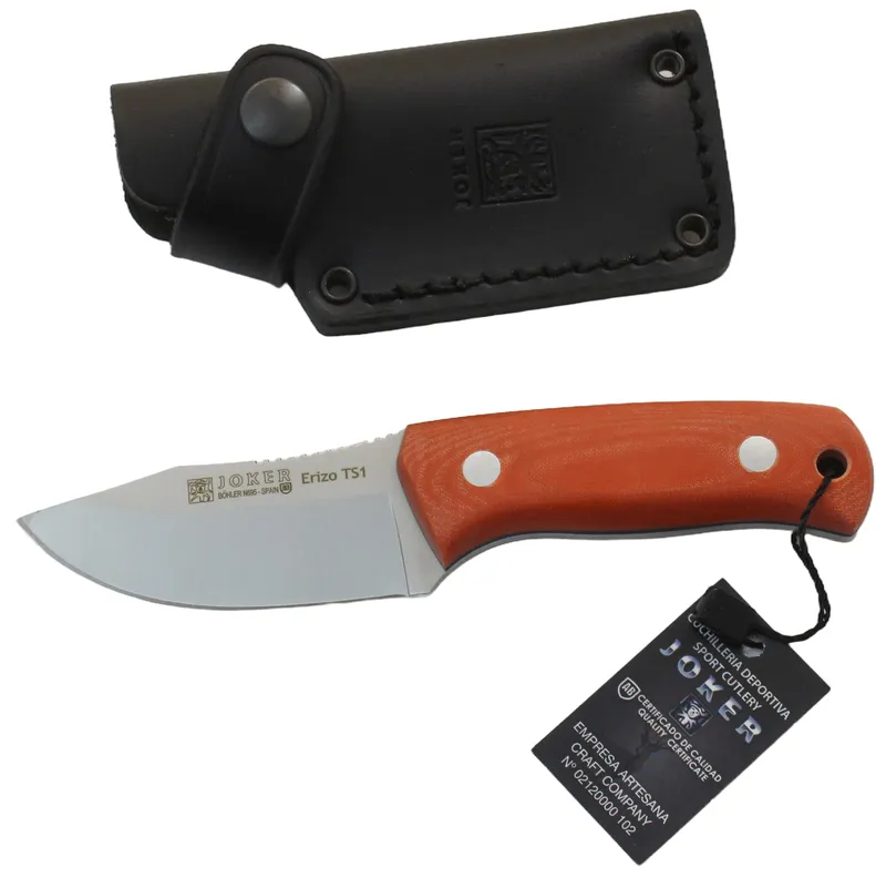 Das Outdoormesser Erizo TS1 aus Spanien von der Firma Joker ist ein schönes, kleines und kräftiges Messer mit einer 7,5cm rostfreien Klinge aus Böhler N695 Stahl. Das Messer wird mit einer Lederscheide und Paracord geliefert, so dass es um den Hals als Neck-Knife getragen werden kann. Gewicht ca. 135g. Oranges micarta mit schwarzem Liner. Die Verarbeitung ist Preis-Leistungsbedingt mit gut zu bewerten. Immer wieder sind daher direkt auf der Klinge die letzten Schleifspuren / Schleifrichtung zu erkennen, da die Klingen nicht auf Hochglanz poliert sind, sondern dem Einsatz entsprechend.