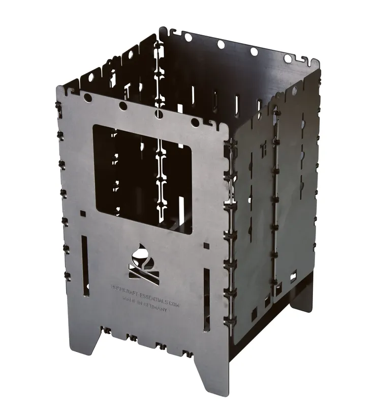 Die Bushbox XL in der superleichten Titan-Ausführung. Nur 490g schwer (540g mit Tasche). Die thermisch besonders belasteten Teile (Bodenblech, Topfauflagen) sind aus Edelstahl, da sich Titanteile zu stark verziehen würden. Die Lieferung erfolgt inkl. strapazierfähiger Outdoor-Tasche.
